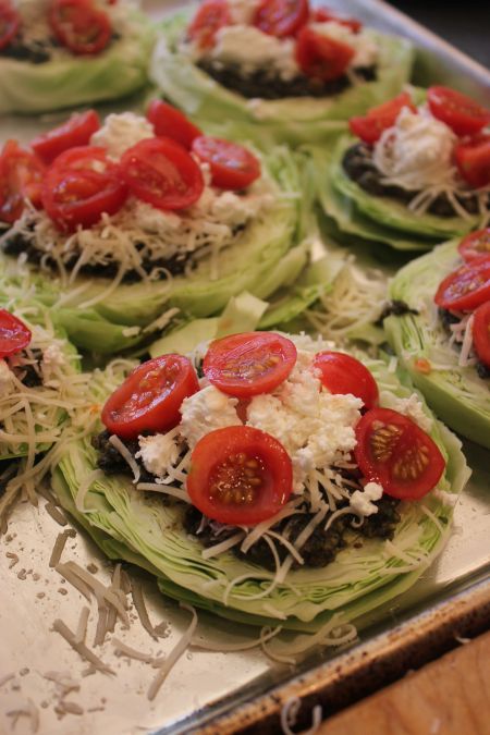 Heat oven to 400 and grease a large sheet pan. Arrange cabbage steaks in a single layer on the sheet pan so the edges are all touching. Slather pesto on the steak halves and be generous as a lot will melt into the cabbage. Top with cheese and tomato. Bake until the edges of the cabbage are crisp and all of the cheese is bubbly, about 20 minutes. Sprinkle with seasonings and basil. Serve hot. You could have an extra scoop of Pesto for dipping!